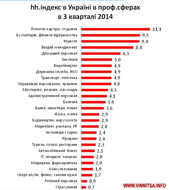 В цілому по Україні найбільшим попитом серед роботодавців користуються спеціалісти зі страхування і робочі. На одне робоче місце претендує 0,7 і 0,9 пошукачів відповідно. Найбільша конкуренція спостерігається серед пошукачів без досвіду роботи, студентів – на одну вакансію 11,1 претендентів, спеціалістів у сфері фінансів – 9,5 і юристів – 9,4.