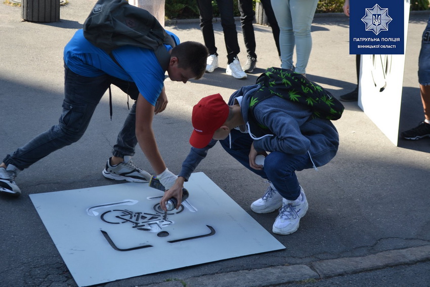 Учні шкіл та студенти наносили попереджувальні написи на асфальті біля перехресть та пішохідних переходів. «Подивись», «Візьми дитину за руку», «Зніми навушники», «Сховай телефон», «Велосипедист» − такі нагадування для пішоходів та велосипедистів розмістили на тротуарах.