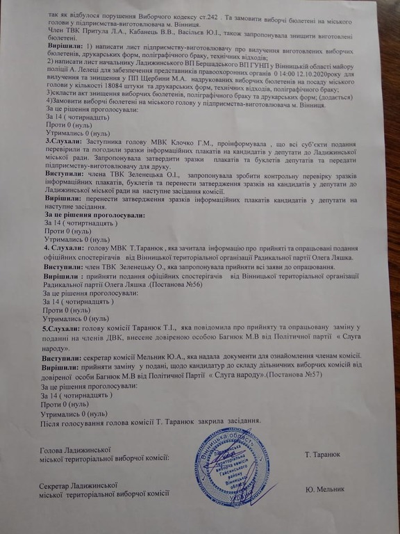 «В неділю 11.10.20 р. під час засідання в телефонному режимі ПП Щербіна М. А. повідомив, що виготовив 18084 штуки виборчих бюлетенів. В понеділок 12.10.20 р. заступник голови комісії разом з членами комісії: Васільєвим Ю.І., Зеленецькою О.І., Васенко В.Л. здійснили перевірку виготовлених бюлетенів. Ними було виявлено, що виборчі бюлетені виготовлені без захисної сітки, без попереднього погодження та присутності членів Ладижинської територіальної виборчої комісії та контрольної комісії з виготовлення виборчих бюлетенів, затвердженої Ладижинською міською територіальною виборчою комісією», - зазначено у протоколі засідання ТВК.