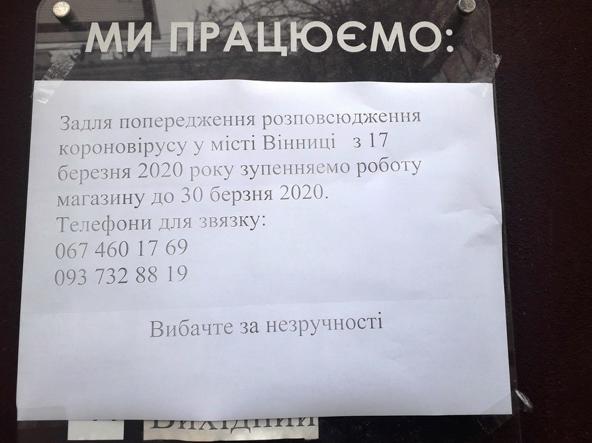 У Вінниці деякі заклади і магазини призупинили свою роботу на час запровадження карантину. Зранку 17-го березня на їх дверях з’явилися відповідні вивіски. Зокрема у центрі міста не працює квест-кафе, магазин техніки, магазин одягу, кінотеатр ім. Коцюбинського, в «Експоцентрі» перенесли заплановану виставку саджанців, нотаріус повідомив, що надає консультації дистанційно…