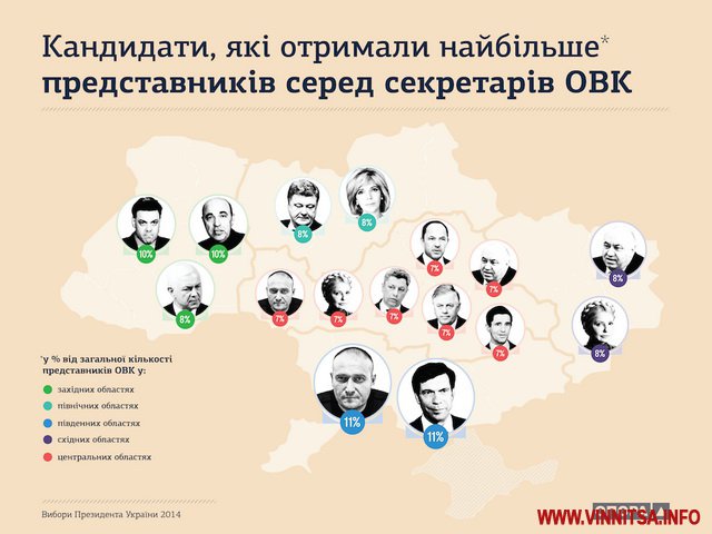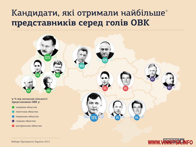 Починаючи з квітня, частина кандидатів у Президенти вже розпочала активну агітацію, подорожуючи по регіонах та формуючи виборчі штаби на місцях. Більшість кандидатів мають своїх представників у всіх 213 окружних виборчих комісіях або майже в усіх (дехто з них заповнив 210 або 212 ОВК). Однак п’ятеро кандидатів у Президенти делегували своїх представників не до всіх ОВК, обмежившись певними регіонами і округами. Наприклад, Олег Царьов не подав кандидатур до складу ОВК західноукраїнських областей – Волинської, Львівської, Закарпатської, Івано-Франківської, Тернопільської і Хмельницької. А Михайло Добкін не має своїх представників в ОВК Київської, Львівської та Рівненської областей. Втім, кожен кандидат отримав частку керівних посад пропорційно кількості поданих кандидатур до складу ОВК, які розподілялися за допомогою єдиної інформаційно-аналітичної системи «Вибори».