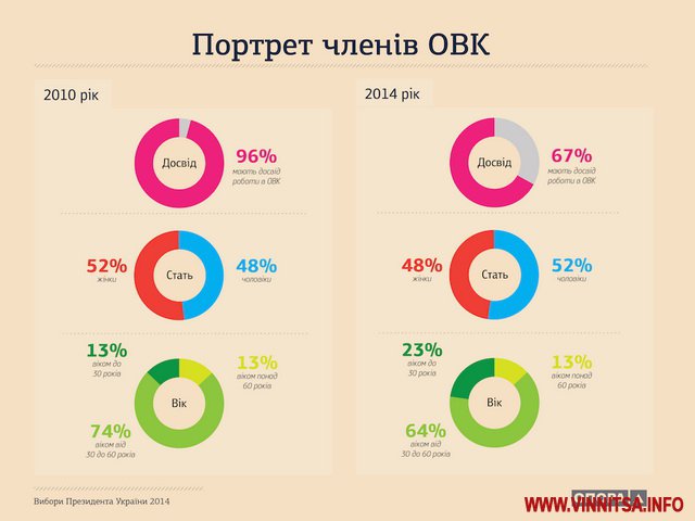 Всього ж до роботи окружних виборчих комісій залучено 4 164 особи. З них – 52% чоловіків та 48% жінок. Попередній досвід роботи у виборчих комісіях мають майже 67 % делегованих до їхнього складу осіб. Тоді як на останніх президентських виборах 2010 року цей показник становив 95,5%. Так само зменшилася кількість членів ОВК з вищою освітою – з 93% (у 2010 році) до 83% (у 2014). Однак зросла кількість молоді в ОВК – особи віком до 30 років становлять майже чверть (23 %) складу виборчих комісій, у 2010 році їх було 13% і лише 11% у 2004 році.