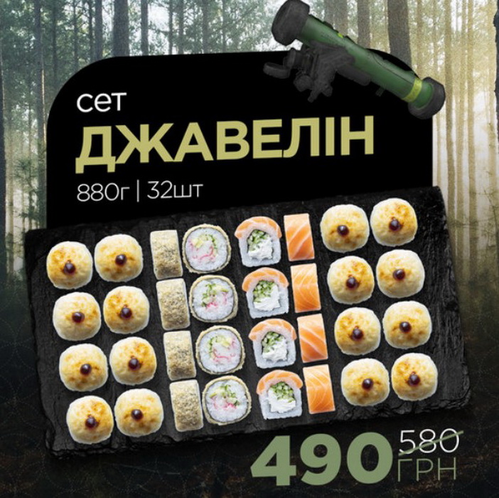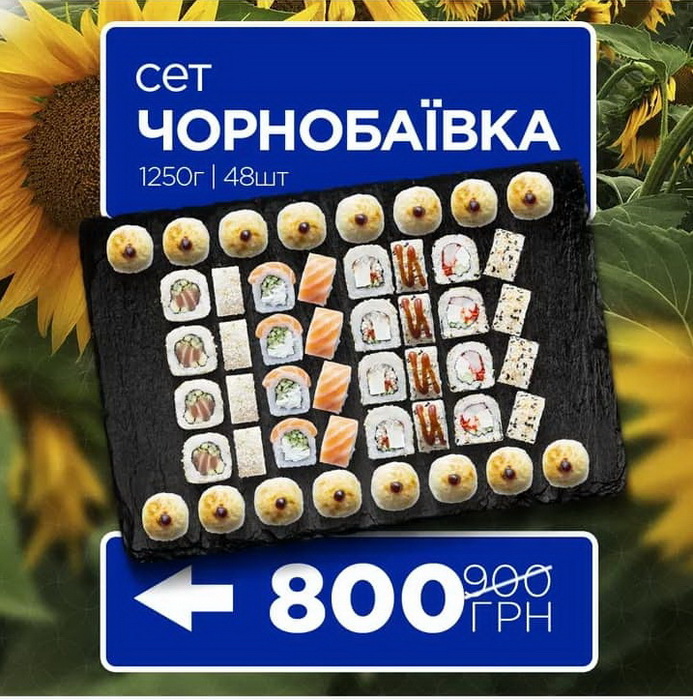 У Вінниці місцевий заклад з приготування японської кухні пропонує своїм клієнтам суші-сети з оригінальними назвами. Наразі, відомо про: «ЗСУ», «Джавелін» та «Чорнобаївка». Рекламуючи їх, винахідливі власники й додають оригінальні заманливі пояснення: «Сет «Чорнобаївка» - навіть у 18 раз смакує, як уперше!». Його фоторекламу для соціальних мереж оформили на фоні поля з соняхами та з використанням тексту на ніби дорожніх знаках. До речі саме «Чорнобаївка» і є найдорожчим з запропонованих сетів. Бо є найважчим серед них – 1250 грамів.