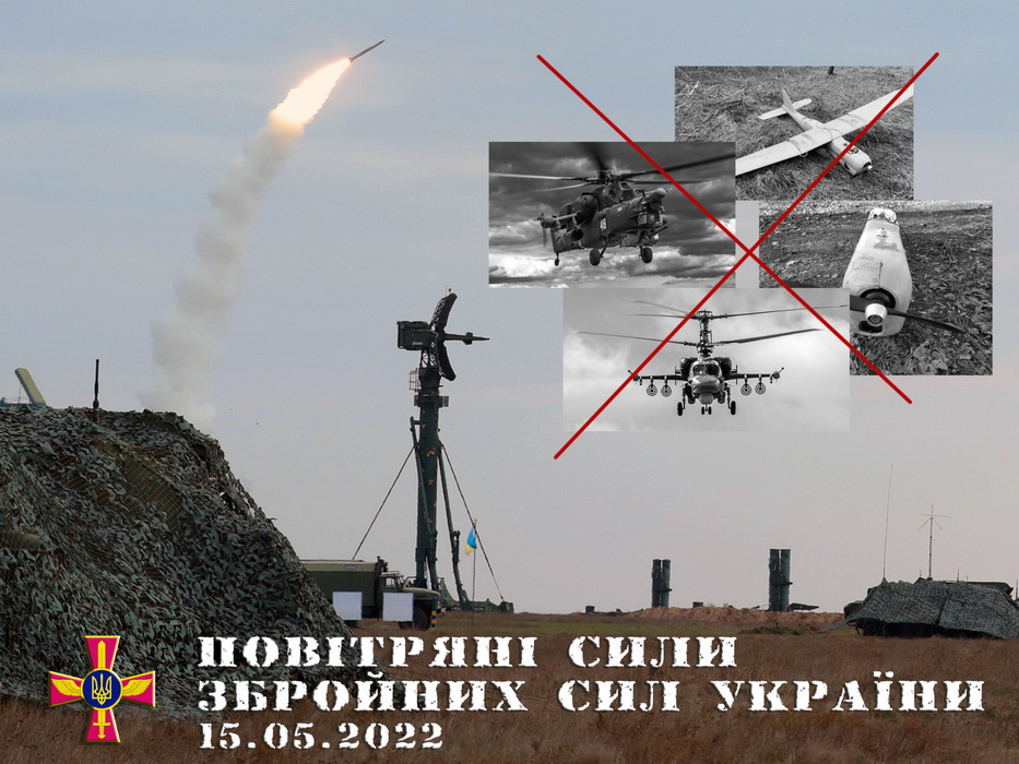Протягом 15 травня, Зенітні ракетні війська Повітряних Сил збили дві крилаті ракети, три БпЛА "Орлан-10" та вертоліт Ка-52.